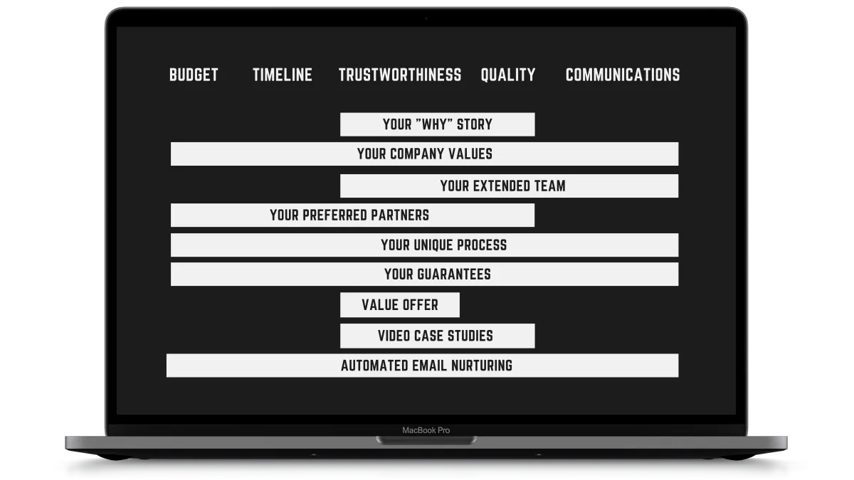 Branding , Website, Photography, Video Case Studies, Guarantees, Demonstrating your “Why” and outlining Your Process.